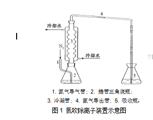 子轉(zhuǎn)化為氨氣,通過氮氣的吹送,將溶液中的氨氣導入硼酸溶液吸收。樣品瓶上端安裝循環(huán)冷卻水裝置,防止部分低沸點有機物揮發(fā)。