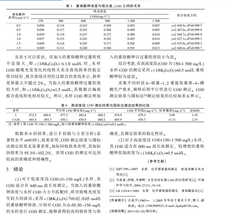 7 )=0.02 mol/L,COD 為 10~50 mg/L 時(shí), 水樣 COD 與吸光度
