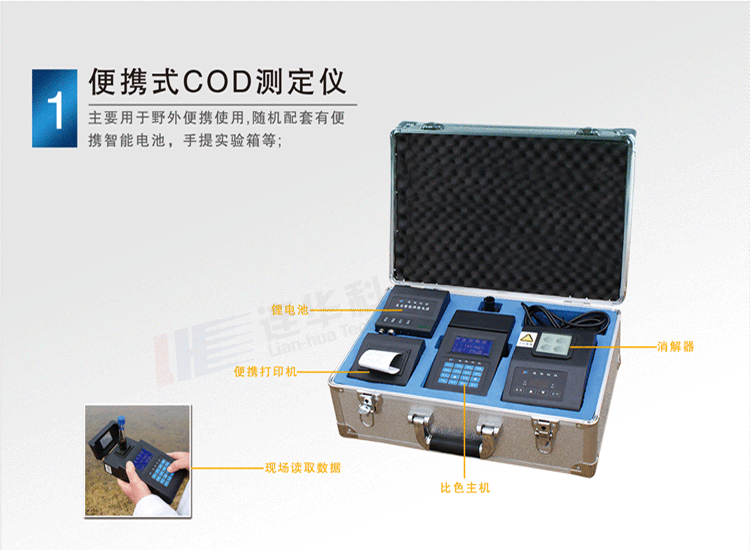 5B-2A型精巧便攜型化學耗氧量(COD)測定儀是專為野外應急監測設計的一款手持設備,"手持"是它的主要特點;不但此型號配備的所有附件均為手持;而且為了現場應急,電源的提取可以多種方式:點煙器、高能電池、4節5號普通電池。